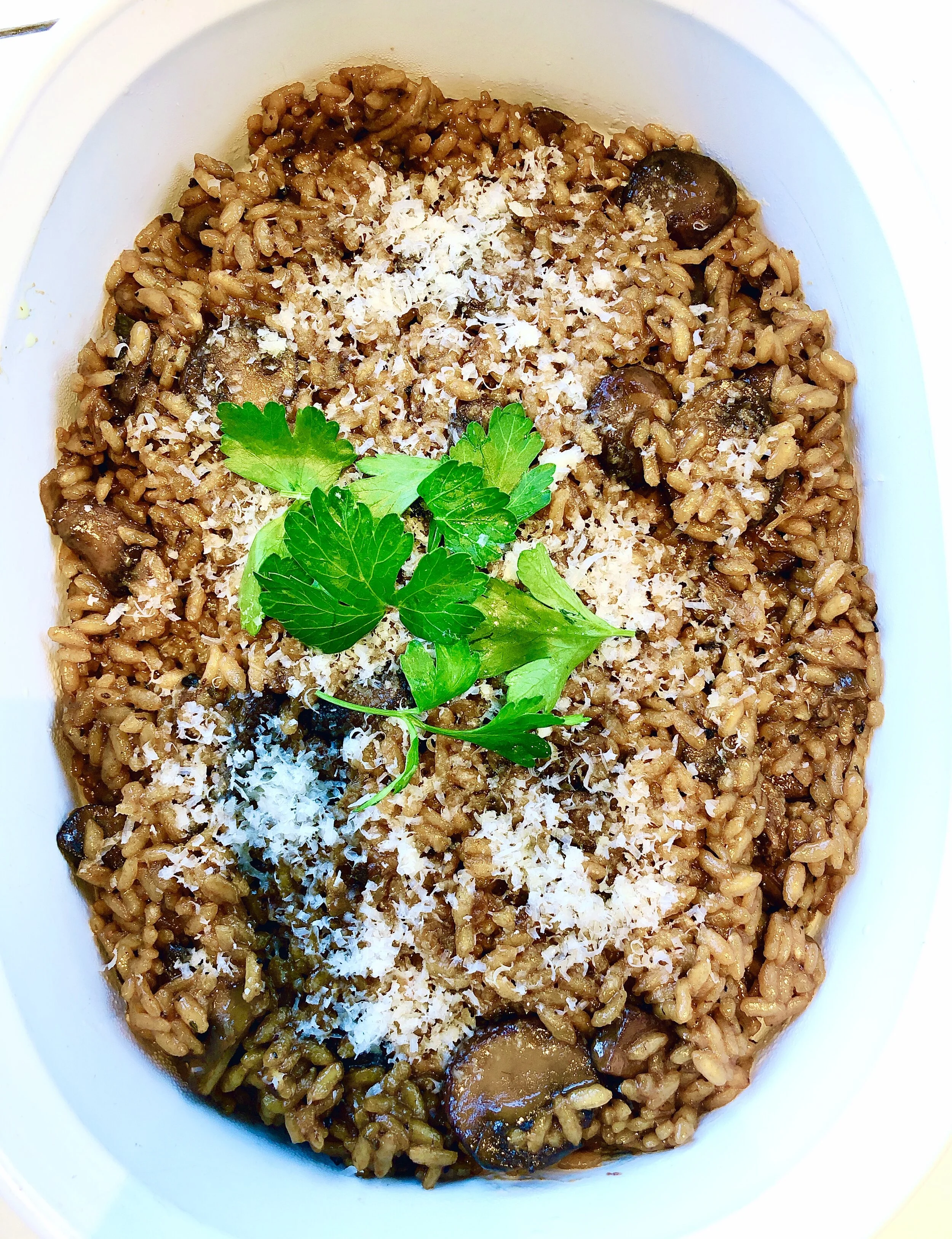 Pour in 1/2 cup broth and allow to fully absorb until adding more in 1/2 cup increments. Stir often. Mix in 1/2 cup and some of parmesan cheese. Season with salt and pepper. Once complete mix in truffle oil and finish with parsley!